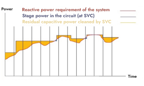SVC load drivers and monophase shunt reactors connected to each phase are switching elements that enable precise compensation even at low powers by activating as much as the system needs.